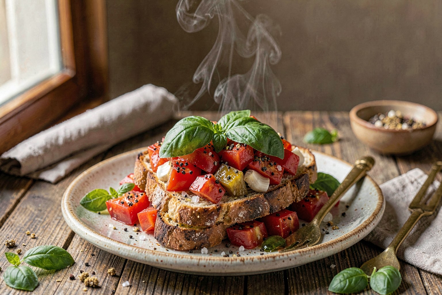Bruschetta (from the Roman dialect 'bruscare', meaning to roast over coals) originated as a practical way for Italian farmers to use up stale bread and test the quality of the new olive oil harvest. While often served as an antipasto, it is frequently enjoyed as a light, refreshing dinner in the hot Tuscan and Roman summers. Authentic preparation relies on the quality of the ingredients: the bread must be coarse and dry enough to hold the oil without becoming soggy immediately, and the tomatoes should be ripe and fragrant.
