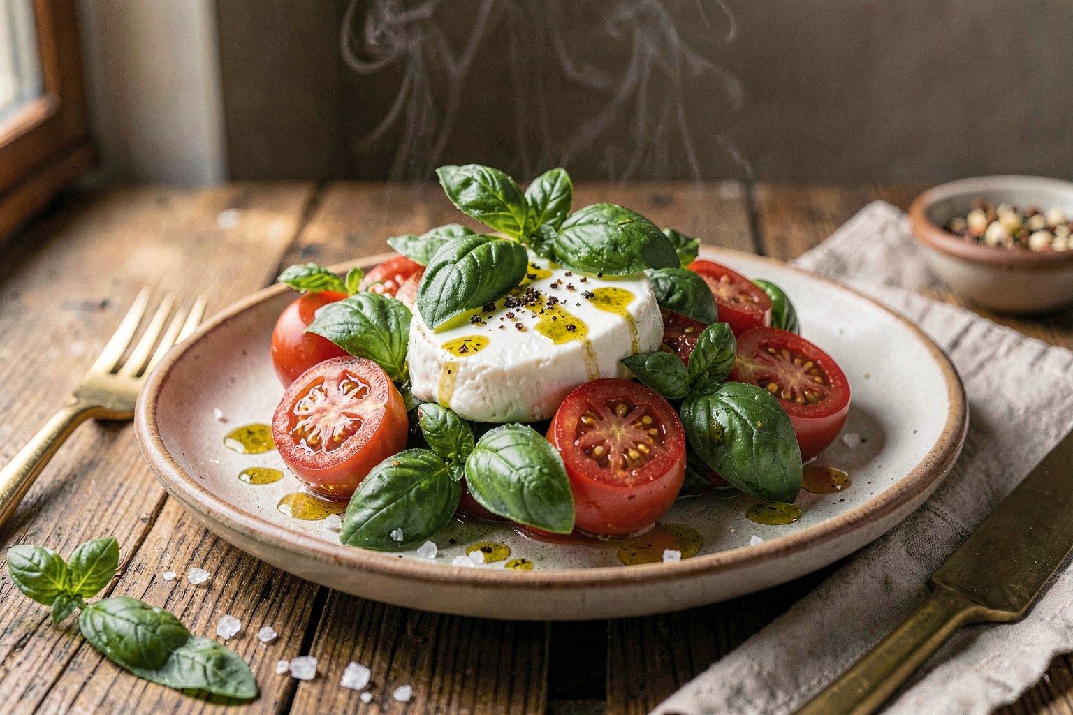 This vibrant Neapolitan salad features creamy mozzarella di bufala, ripe heirloom tomatoes, and fragrant basil. Drizzled with high-quality olive oil, it offers a fresh, savory balance perfect for a light dinner.