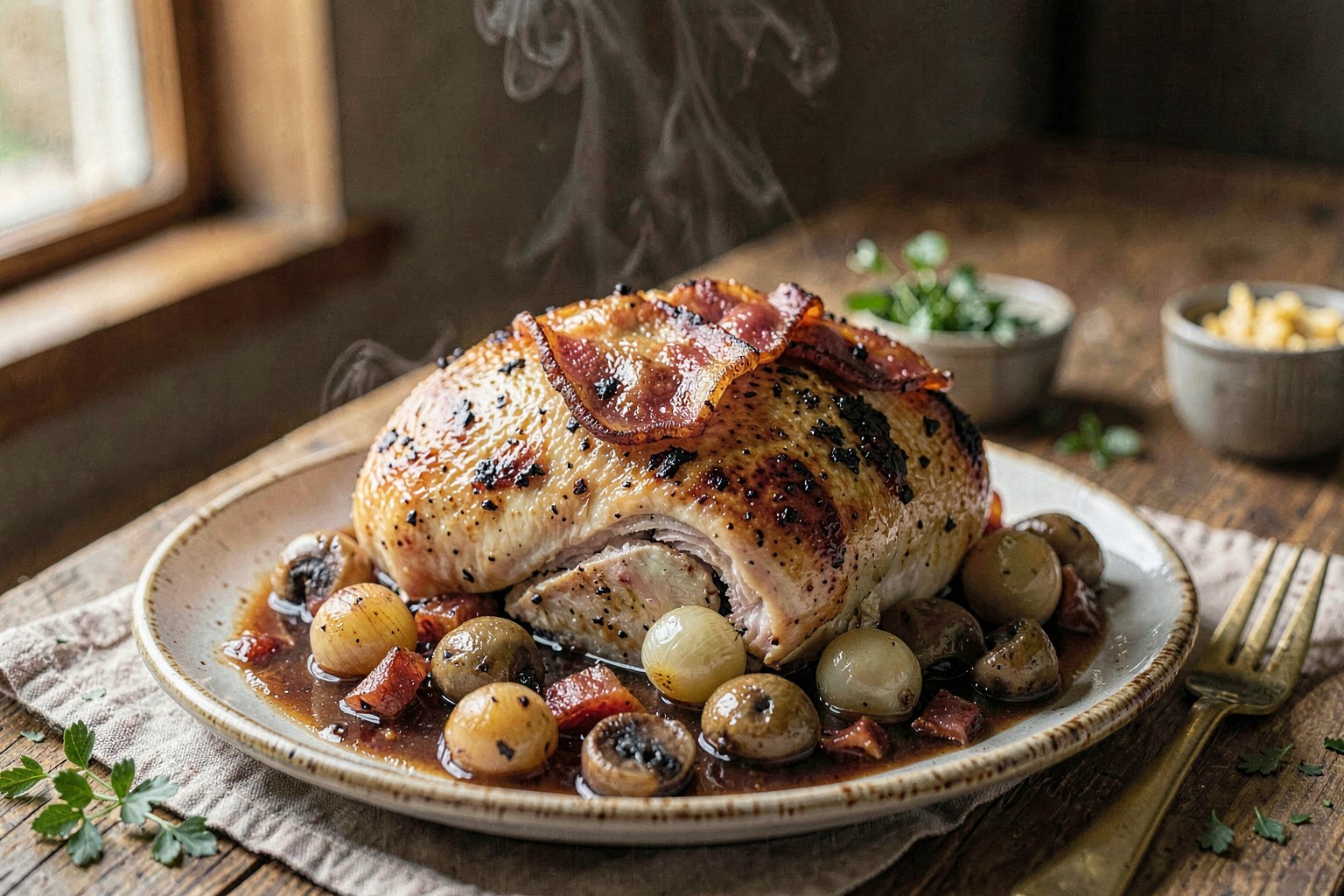 Chicken braised in red wine with crispy lardons, pearl onions, and mushrooms creates a rich, peppery sauce. This classic French dinner offers tender meat and deep umami flavors perfect for a cozy evening.