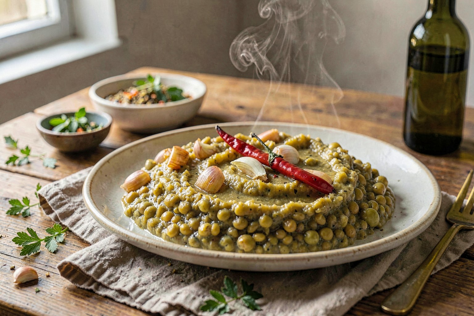A classic Aegean meze transformed into a hearty dinner, this dish features yellow split peas slow-cooked until they dissolve into a luxurious, velvety purée. The earthy, nutty flavor is elevated by a generous pool of fruity extra virgin olive oil, sharp red onion, and a hint of heat from dried chili flakes.