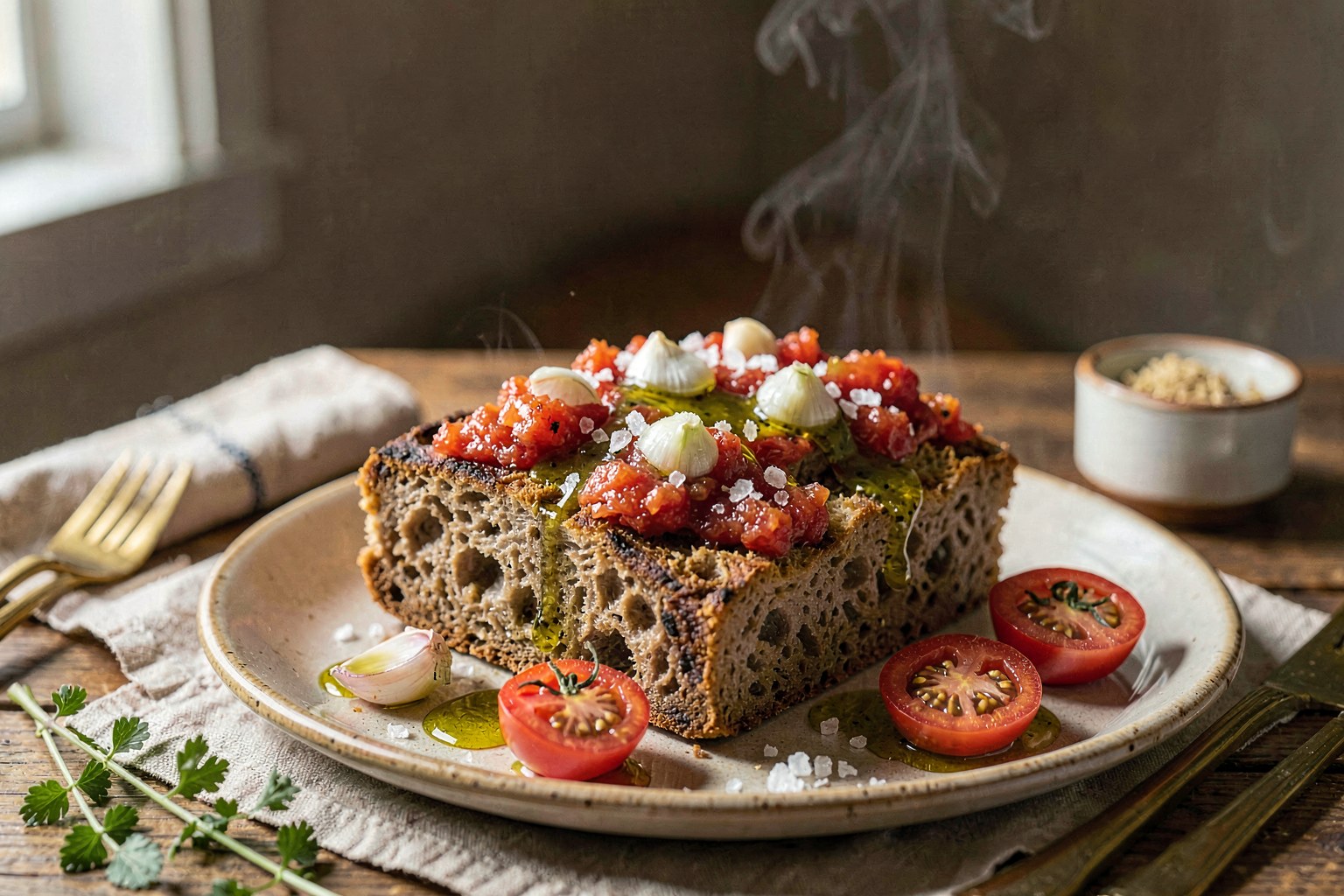 Originating in Catalonia, this dish is known locally as pa amb tomàquet. It dates back to the 19th century when laborers used tomato pulp to soften stale bread. It is traditionally served as a tapa, a breakfast item, or a simple side to cured meats and fish. Authenticity lies in the quality of the bread and the tomato; using a grater to release the pulp is the standard technique.