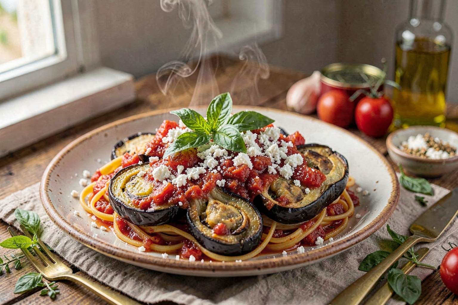 A classic Sicilian dish featuring fried eggplant, rich tomato sauce, and salty ricotta salata. It balances sweet tomatoes with savory cheese and aromatic basil for a comforting summer meal. This rustic plate is best served hot with crusty bread to soak up the sauce.