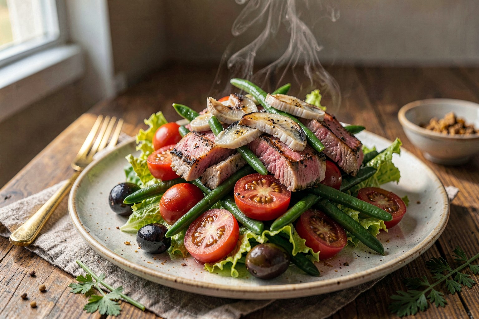 Originating in Nice, France, this salad was traditionally a meal for fishermen and farmers, relying on ingredients available in the local market. Authentic versions from the region strictly exclude cooked vegetables like potatoes and cooked tuna; instead, they feature raw tomatoes, blanched green beans, and oil-packed tuna or anchovies. While international versions often include potatoes and warm seared tuna, the 'authentique' style keeps the components distinct and raw or lightly blanched to preserve their individual textures and the bright acidity of the dressing.
