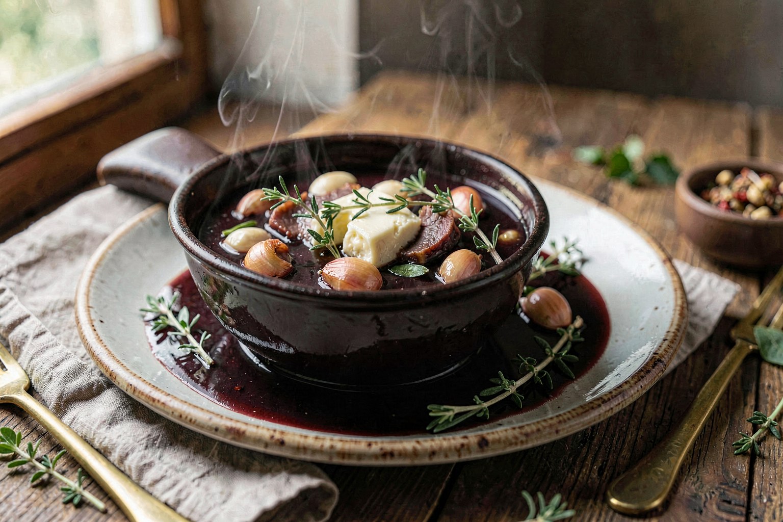 - Full-bodied red wine (Bordeaux or Malbec)