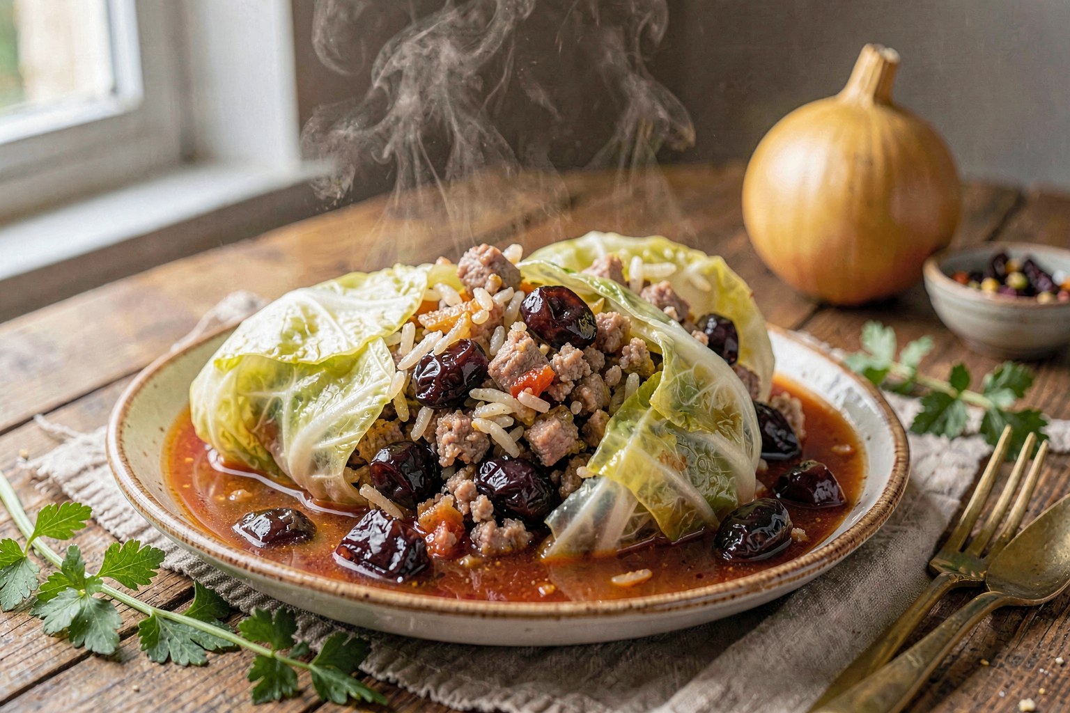 Tender, pickled cabbage leaves are wrapped around a savory filling of seasoned pork mince, rice, and sweet prunes, then slow-stewed in a rich, smoky tomato broth. The result is a deeply comforting dish where the tang of the sauerkraut perfectly balances the sweetness of the fruit and the richness of the meat.