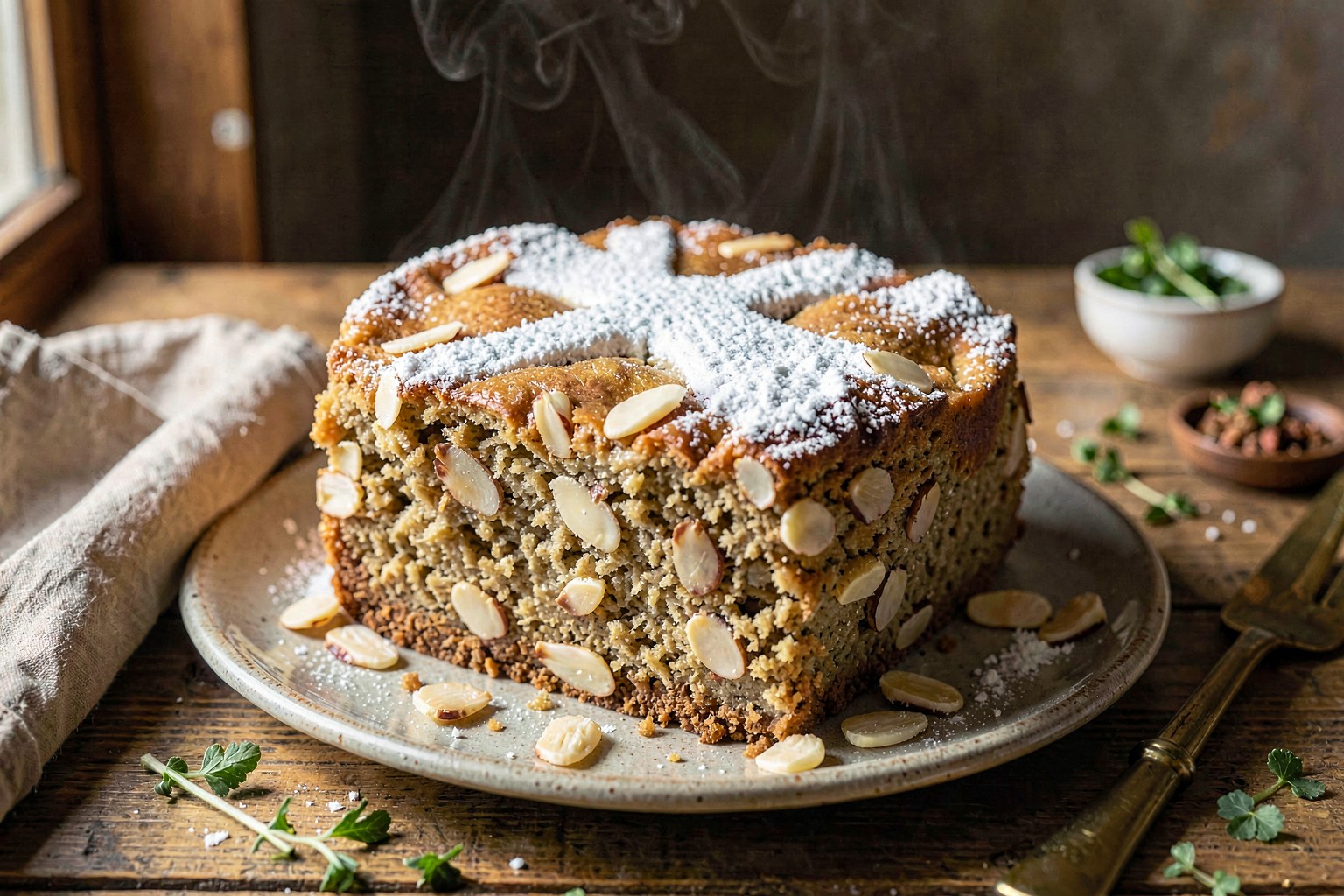 A rustic, dense almond cake from Galicia with a moist, chewy interior and a crisp, golden crust. It is traditionally dusted with powdered sugar in the shape of the Cross of Saint James, offering a rich, nutty flavor that balances perfectly with sweet dessert wines.