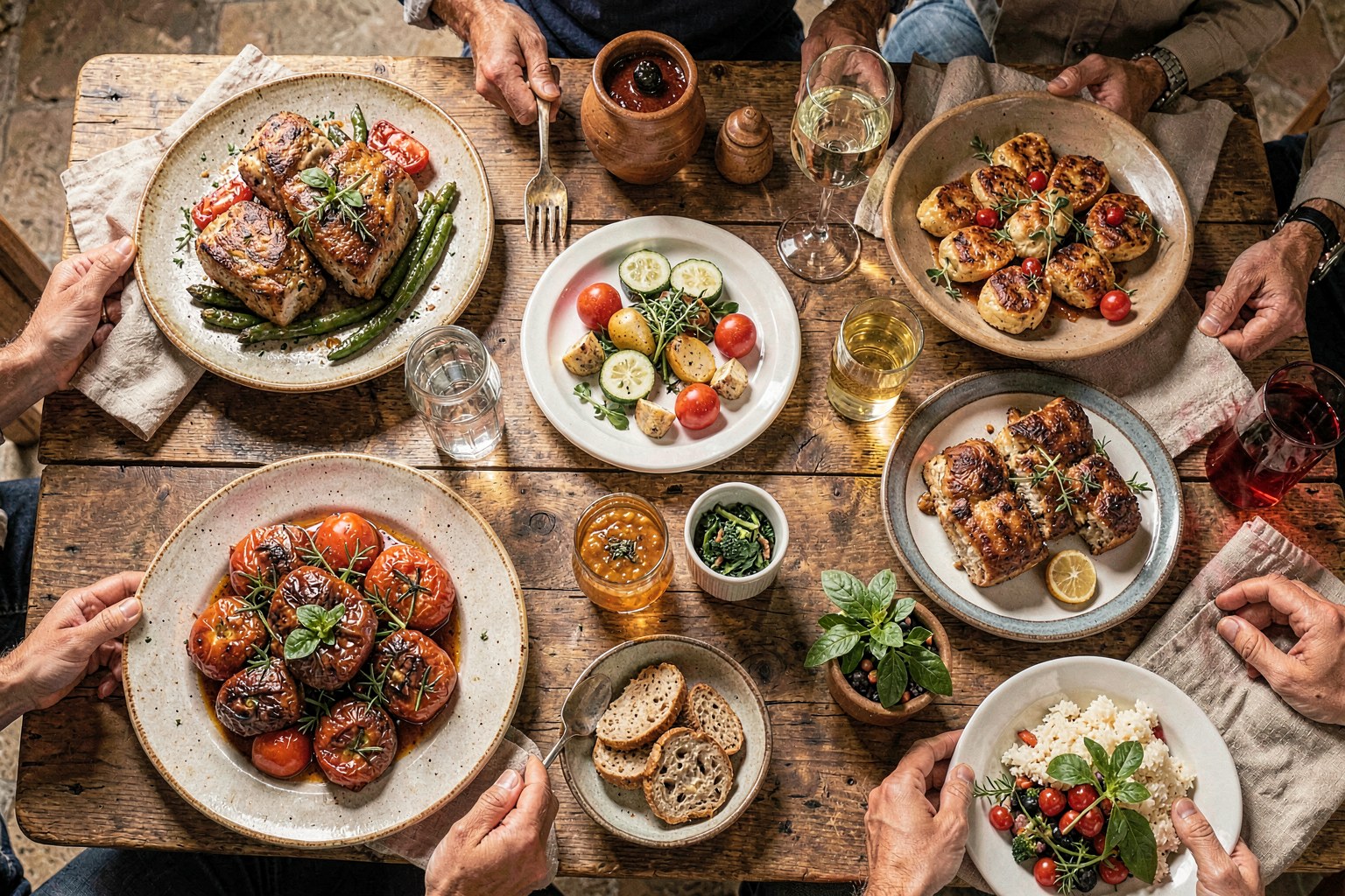 Slow-roasted okra and eggplant in a rich tomato-herb bath, finished with cooling, probiotic-rich labneh and toasted pine nuts. This Levantine garden classic is baked rather than fried to preserve nutrients while delivering deep, savory complexity.